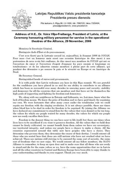 Address of H.E., Dr. Vaira Vīķe-Freiberga, President of Latvia, at the Ceremony honouring military personnel for service in the operational theatres of the Alliance, 29 November, 2006