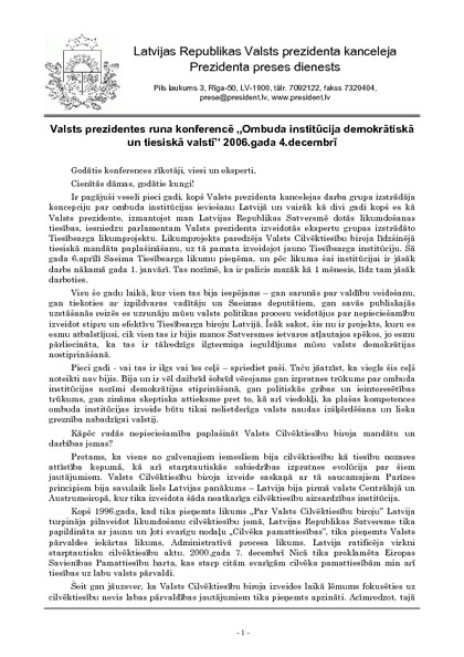 Valsts prezidentes runa konferencē „Ombuda institūcija demokrātiskā un tiesiskā valstī” 2006.gada 4.decembrī