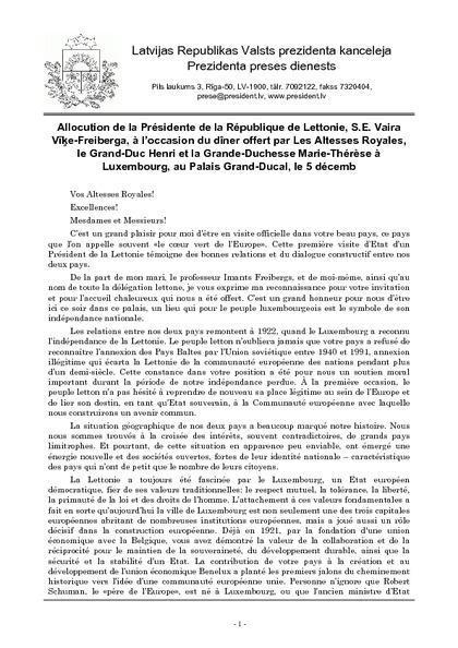 Allocution de la Présidente de la République de Lettonie, S.E. Vaira Vīķe-Freiberga, à l’occasion du dîner offert par Les Altesses Royales, le Grand-Duc Henri et la Grande-Duchesse Marie-Thérèse à Luxembourg, au Palais Grand-Ducal, le 5 décemb