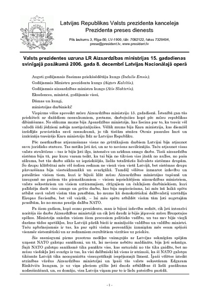 Valsts prezidentes uzruna LR Aizsardzības ministrijas 15. gadadienas svinīgajā pasākumā 2006. gada 8. decembrī Latvijas Nacionālajā operā