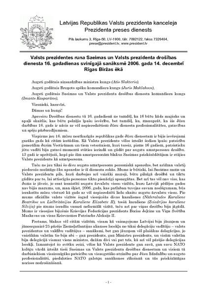 Valsts prezidentes runa Saeimas un Valsts prezidenta drošības dienesta 16. gadadienas svinīgajā sanāksmē 2006. gada 14. decembrī Rīgas Biržas ēkā