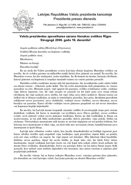 Valsts prezidentes apsveikuma uzruna Hanukas svētkos Rīgas Sinagogā 2006. gada 19. decembrī