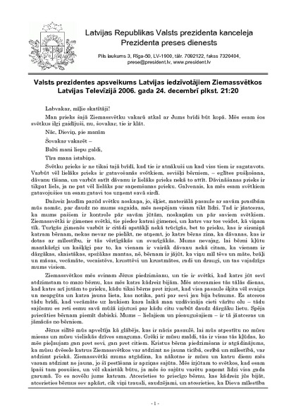 Valsts prezidentes apsveikums Latvijas iedzīvotājiem Ziemassvētkos Latvijas Televīzijā 2006. gada 24. decembrī plkst. 21:20