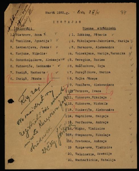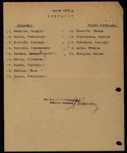 Sabiedrībā “M.S. Kuzņecovs” 1935. gada martā darbā iestājušos un no darba izstājušos darbinieku saraksts. Rezolūcija par politiskās uzticamības pārbaudi Politiskās pārvaldes Rīgas rajonā.23.04.1935.