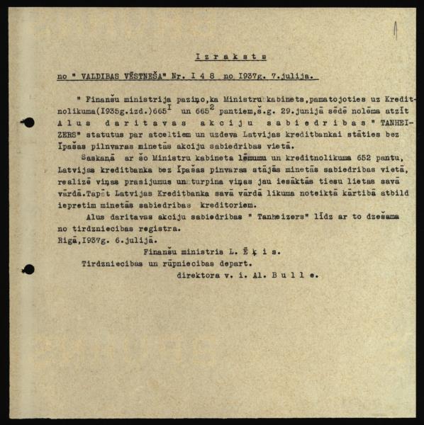 Izraksts no “Valdības Vēstneša” Nr.148 no 07.07.1937. par “Alus darītavas akciju sabiedrības “Tanheizers” statūtu atzīšanu par atceltiem un tās nodošanu Latvijas kredītbankai