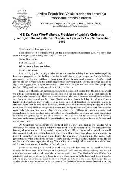 H.E. Dr. Vaira Vike-Freiberga, President of Latvia’s Christmas greetings to the inhabitants of Latvia on Latvian TV1 on 24 December, 2006