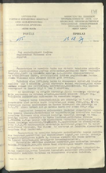 Pavēle Nr.155 Par sociālistiskā īpašuma saglabāšanu Vidzemes alus rūpnīcā