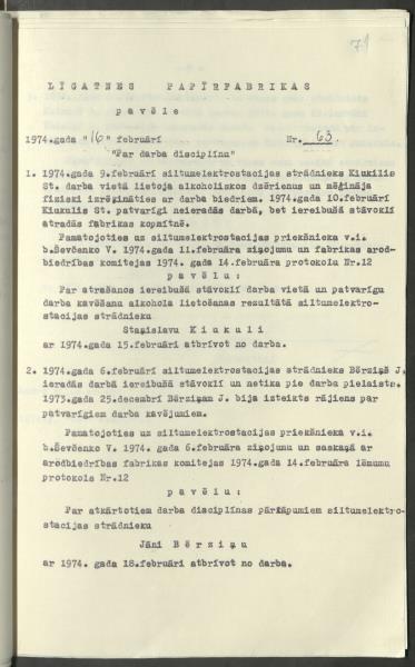 Fonds: Valsts akciju sabiedrība "Līgatnes papīrfabrika". Lieta: Pavēles par personālsastāvu un vispārējo saturu