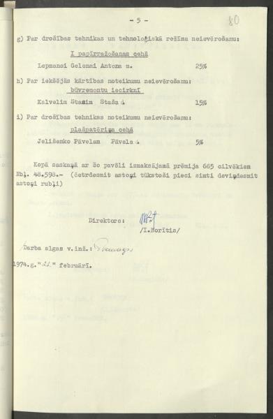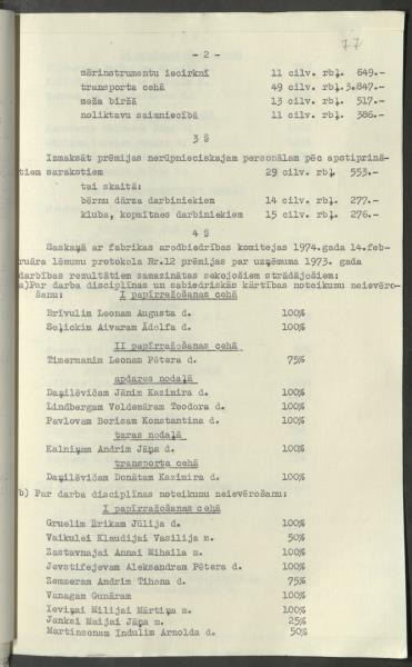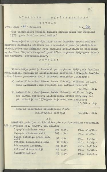 Pavēle Nr.66 “ Par vienreizēju prēmiju izmaksu strādājošiem par fabrikas 1973. gada darbības rezultātiem”