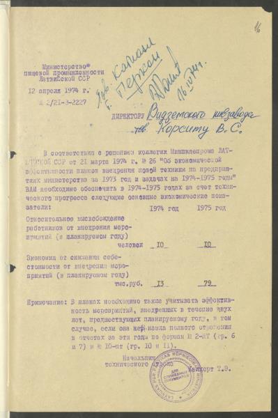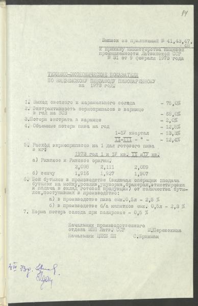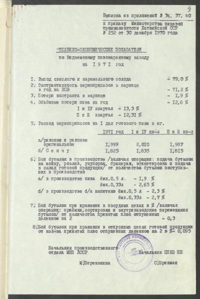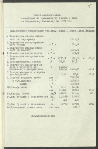 Fonds: Vidzemes alus rūpnīca. Gulbene. Lieta: Vidzemes alus rūpnīcas tehniski-ekonomiskie rādītāji 1969.-1975.gadiem