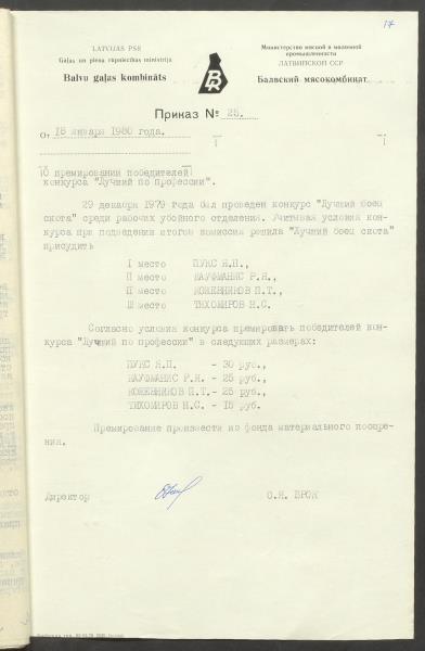 Balvu gaļas kombināta 1980.gada 18.janvāra pavēle Nr.25 par konkursa “Labākais pēc profesijas” uzvarētāju prēmēšana