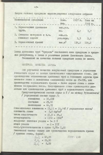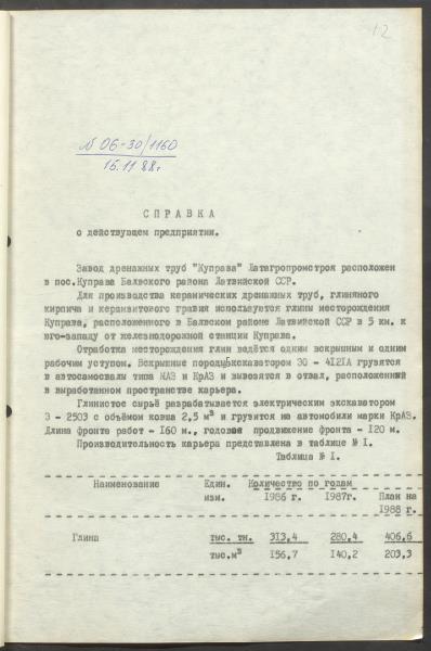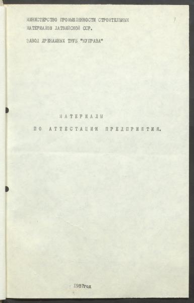 Fonds: "Kuprava", valsts būvmateriālu kombināts. Lieta: Drenu cauruļu rūpnīcas “Kuprava” dokumenti (rādītāji, izziņas u.c.) par rūpnīcas atestāciju