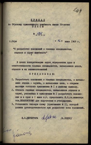 Direktora pavēle Nr.125 par kombināta nolikuma izstrādi galvenajiem speciālistiem, nodaļām un dienestiem