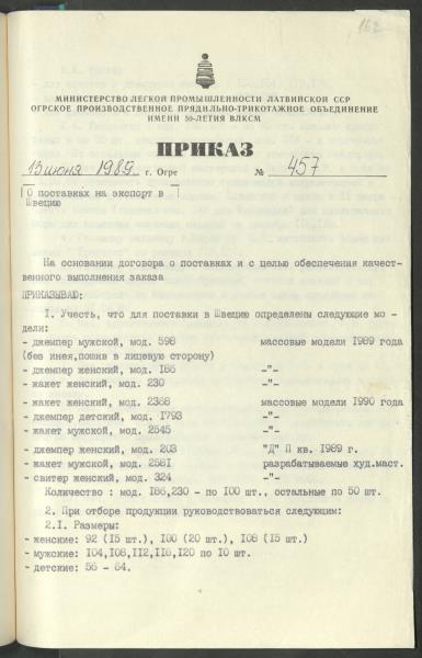 Ģenerāldirektora pavēle Nr.457 par piegādēm eksportam uz Zviedriju