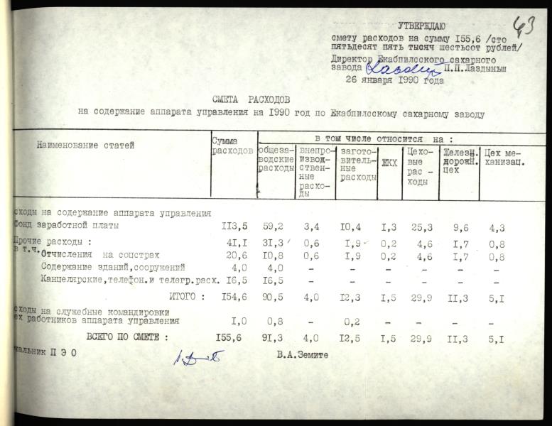 Jēkabpils cukura rūpnīcas izdevumu tāme pārvaldes aparāta uzturēšanai 1990.gadam
