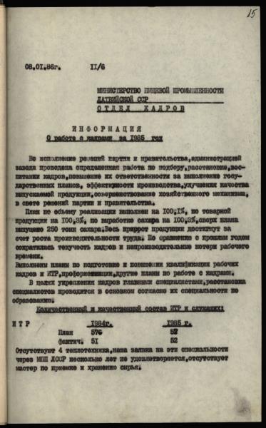 Fonds: Jēkabpils cukurfabrika. Lieta: Gada un kvartālu atskaites un apskati par kadriem un par darbu ar kadriem