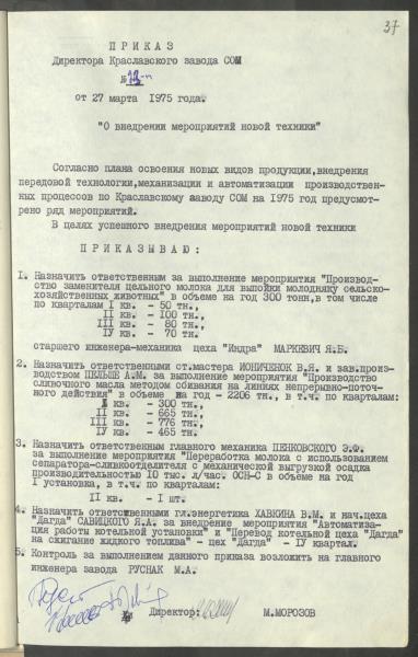Daugavpils piena kombināta Krāslavas sausā vājpiena rūpnīcas direktora pavēle Nr.23-r par jaunās tehnikas ieviešanu