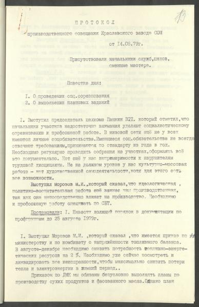 Daugavpils piena kombināta Krāslavas sausā vājpiena rūpnīcas ražošanas sapulces protokols