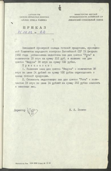 Līvānu stikla fabrikas direktora pavēle Nr.22 par produkcijas iztrūkumu noliktavā