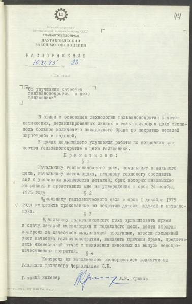 Daugavpils motoveloķēžu rūpnīcas galvenā inženiera rīkojums Nr.28 par kvalitātes uzlabošanu