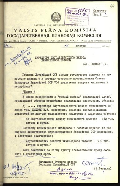 LPSR Valsts plāna Otrās daļas priekšnieka vēstule rūpnīcas direktoram par skābekļa izlaišanas palielināšanu
