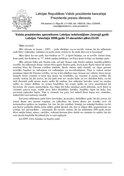 Valsts prezidentes apsveikums Latvijas iedzīvotājiem Jaunajā gadā Latvijas Televīzijā 2006.gada 31.decembrī plkst.23:55