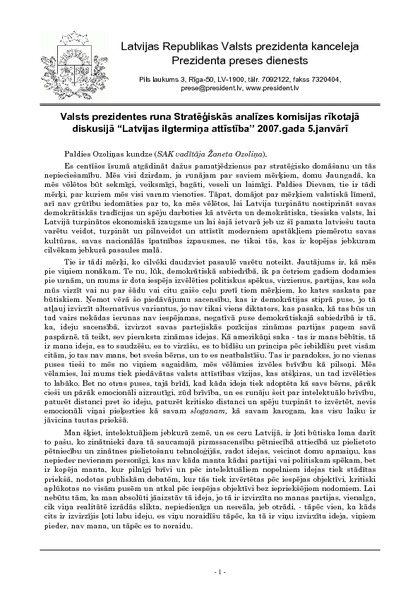 Valsts prezidentes runa Stratēģiskās analīzes komisijas rīkotajā diskusijā “Latvijas ilgtermiņa attīstība” 2007.gada 5.janvārī