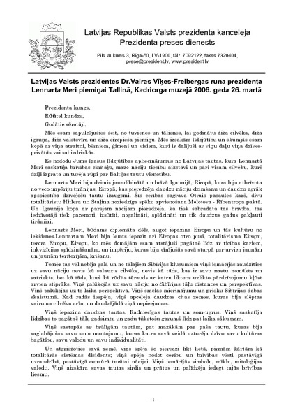 Latvijas Valsts prezidentes Dr.Vairas Vīķes-Freibergas runa prezidenta Lennarta Meri piemiņai Tallinā, Kadriorga muzejā 2006. gada 26. martā