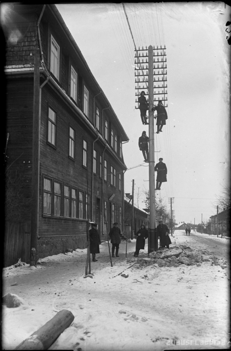 Strenči. Rīgas iela. Elektriķi elektrības stabā