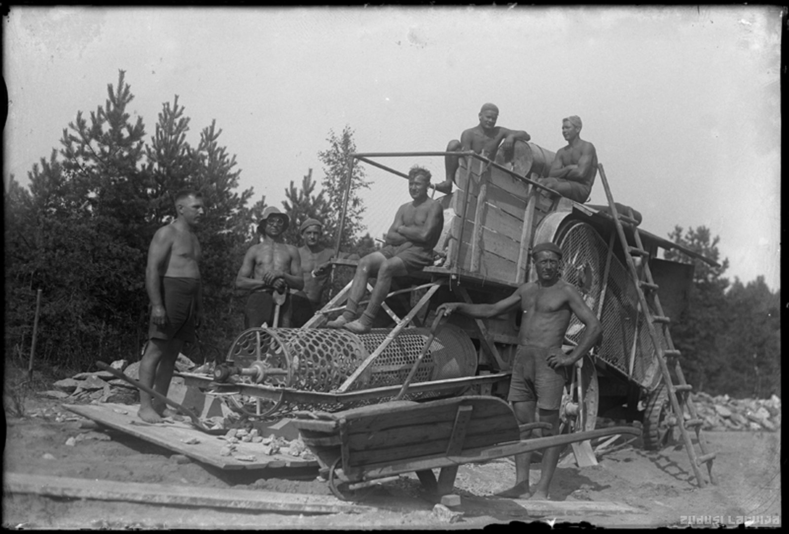 Vīrieši pie akmeņu smalcināmās mašīnas