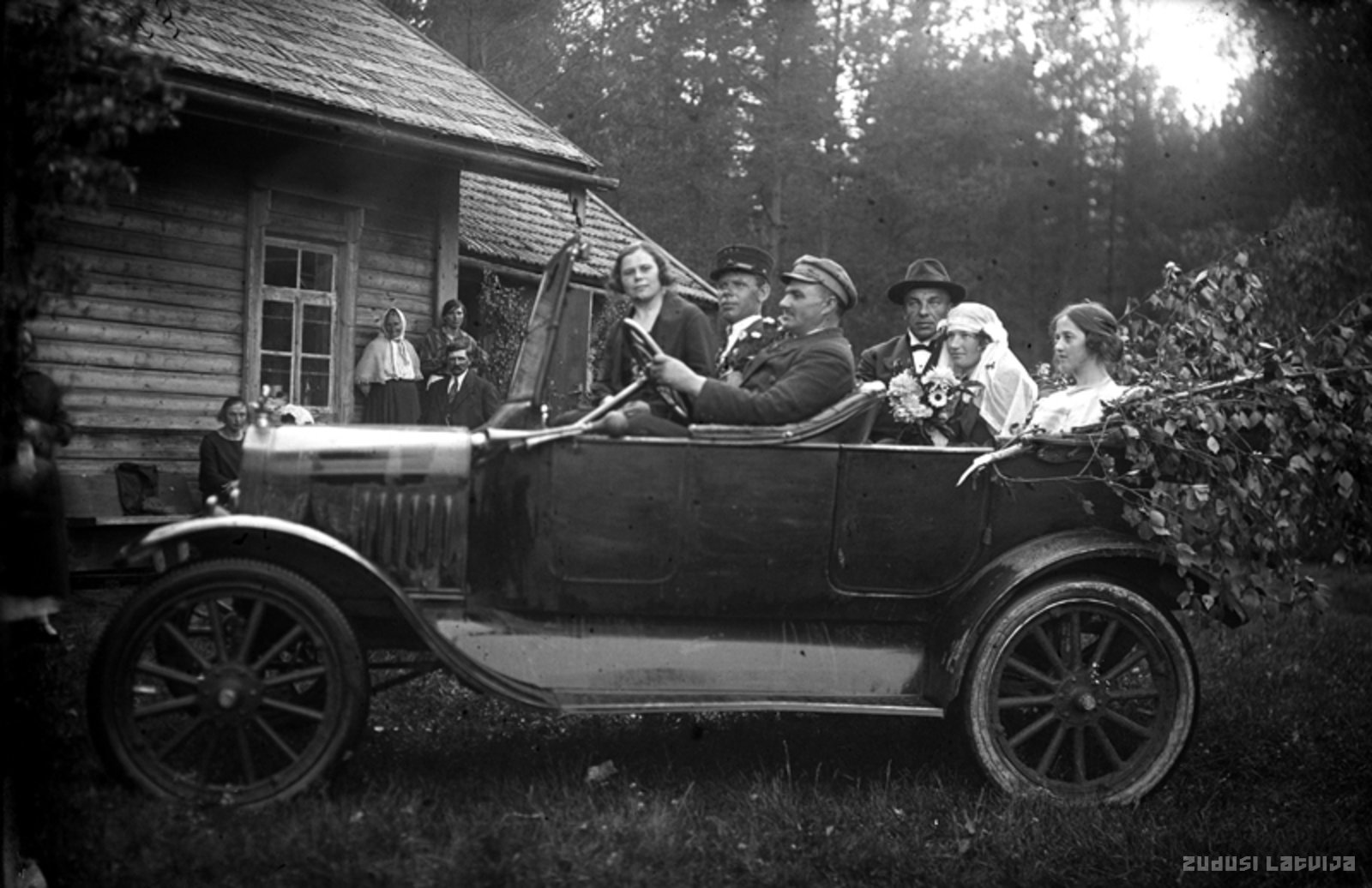 Jaunais pāris ar vedējiem automašīnā