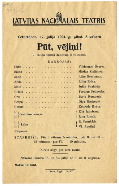 "Pūt, vējiņi!" : J. Raiņa tautas dzeesma 5 cēleenos : Latvijas Nacionalais teatris, ceturtdeen, 17, julijā 1924. g. : [programma]