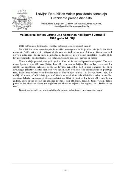 Valsts prezidentes uzruna 3x3 nometnes noslēgumā Jaunpilī 1999.gada 24.jūlijā