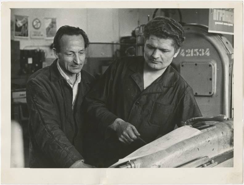 Rīgas motorrūpnīcas "Sarkanā zvaigzne" virpotājs A. Ruža un atslēdznieks V. Bārdiņš