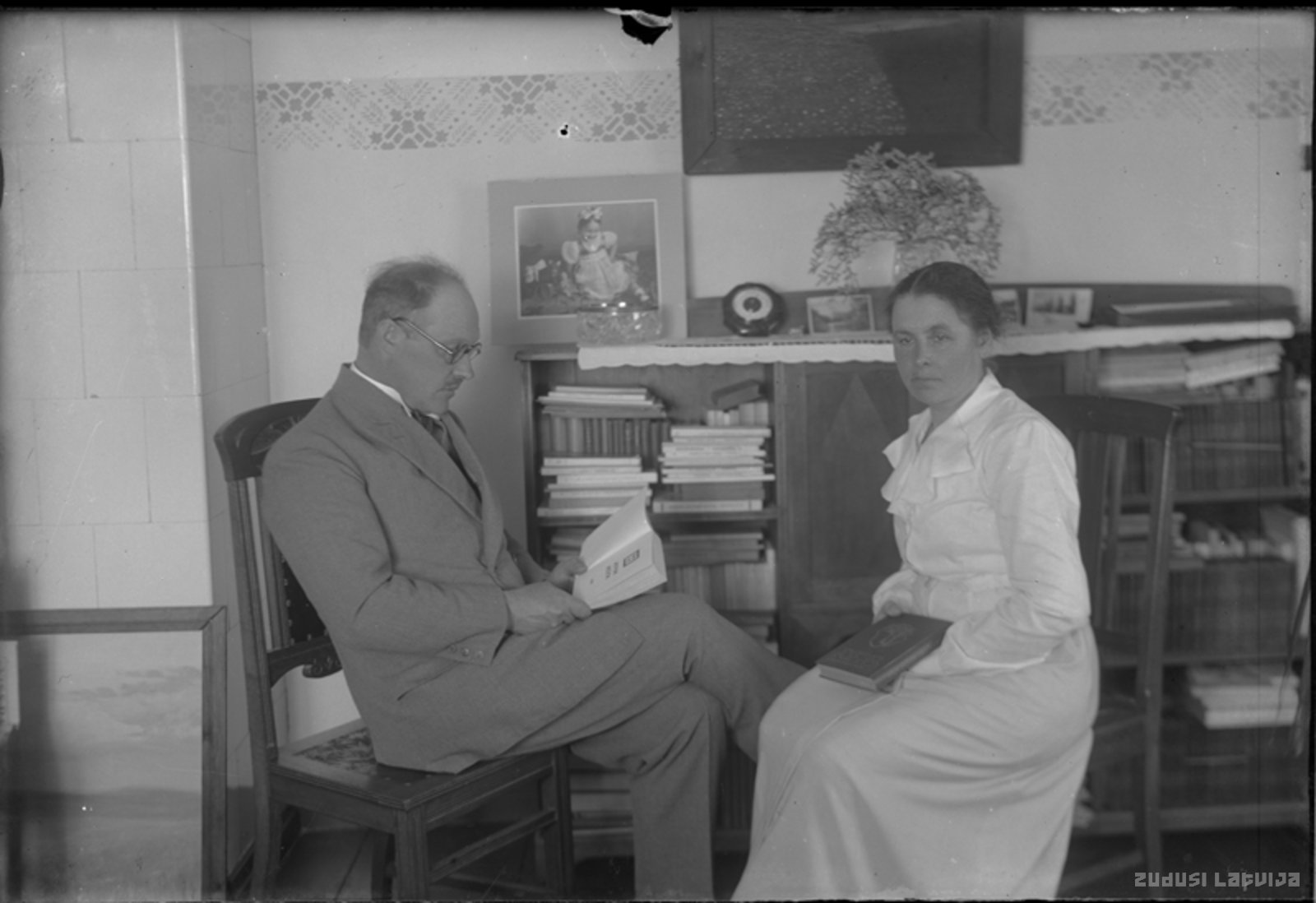 Vīrietis un sieviete ar grāmatām rokās