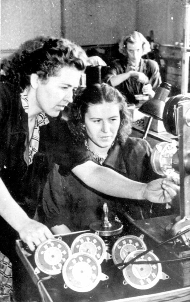 Rīgas autoelektroaparātu rūpnīcas meistare M. Gerasimova (no kreisās) un ierīču regulētāja B. Zirnis veic spidometru kvalitātes kontroli, kas ražoti eksportam.