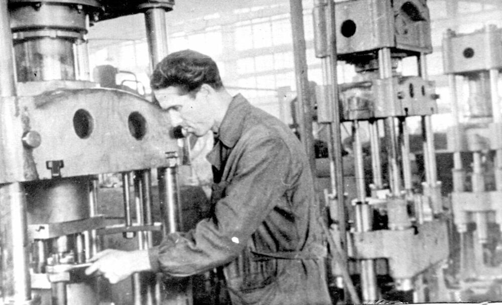 Rīgas autoelektroaparātu rūpnīcas spiešanas un štancēšanas ceha atslēdznieks A. Osis pie preses iekārtas.