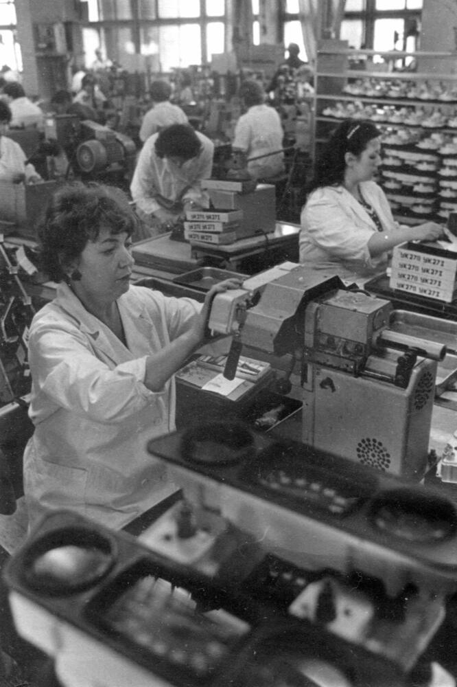 Rīgas autoelektroaparātu rūpnīca. Montāžas ceha tehniskās kontroles nodaļas kontroliere Tatjana Vadina (priekšplānā) darba laikā.