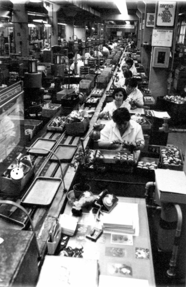 Rīgas autoelektroaparātu rūpnīcas montāžas cehs. Darba process spidometru montāžas iecirknī.