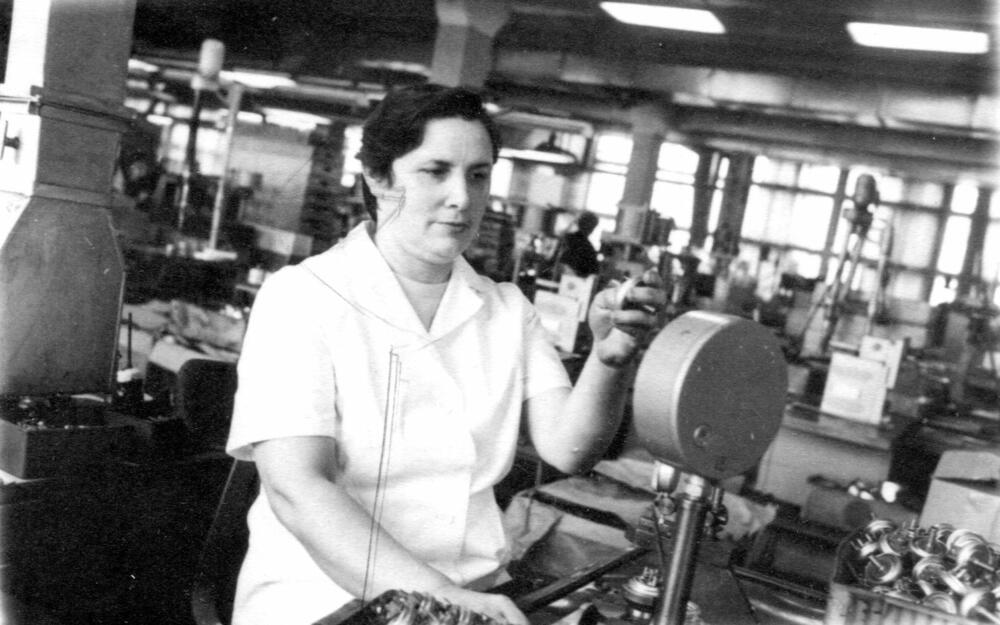 Rīgas autoelektroaparātu rūpnīcas montiere, sociālistiskās sacensības pirmrindniece Aleksandra Fedčuka pie darba galda.