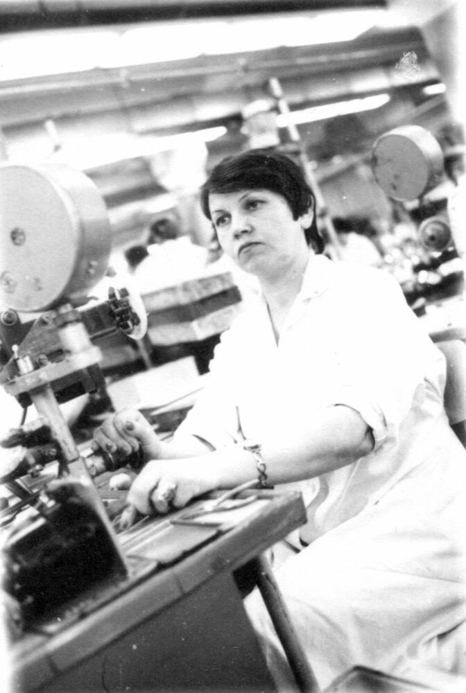 Rīgas autoelektroaparātu rūpnīcas ierīču regulētāja Anna Zaiceva pie darba galda.