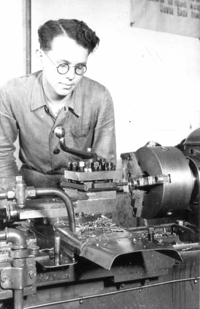 Rīgas autoelektroaparātu rūpnīcas virpotājs, ražošanas pirmrindnieks V. Rocēns pie darba galda.
