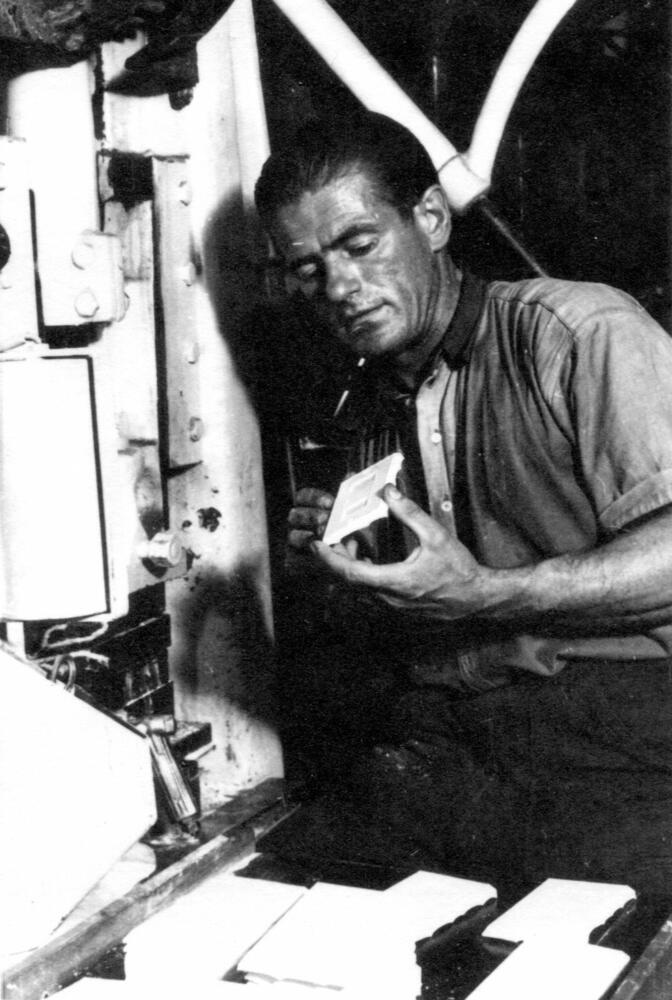 Rīgas autoelektroaparātu rūpnīcas presētājs Harijs Abe pie darba galda.