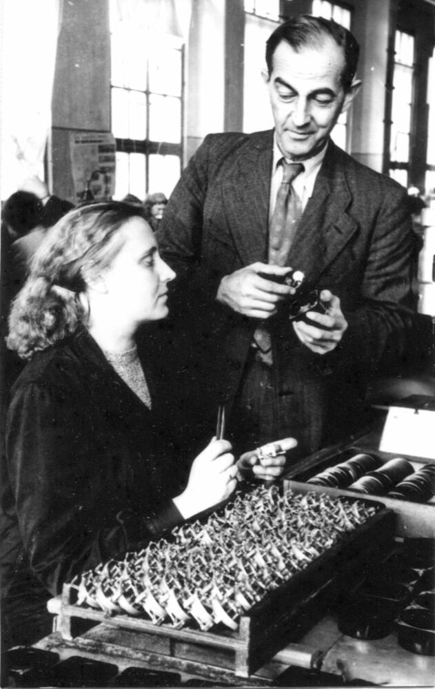 Rīgas autoelektroaparātu rūpnīca. Tehniskās kontroles nodaļas kontroliere M. Trjapkina un vecākais meistars B. Sļepikovskis veic spidometru kvalitātes kontroli.