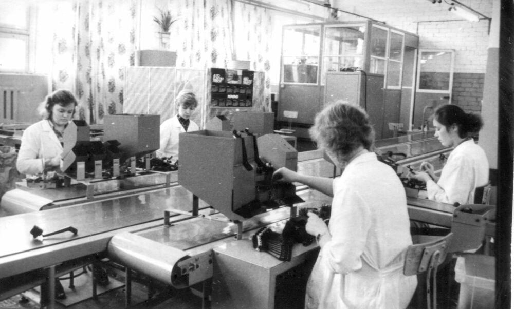 Darba process Rīgas autoelektroaparātu rūpnīcas montāžas iecirknī.