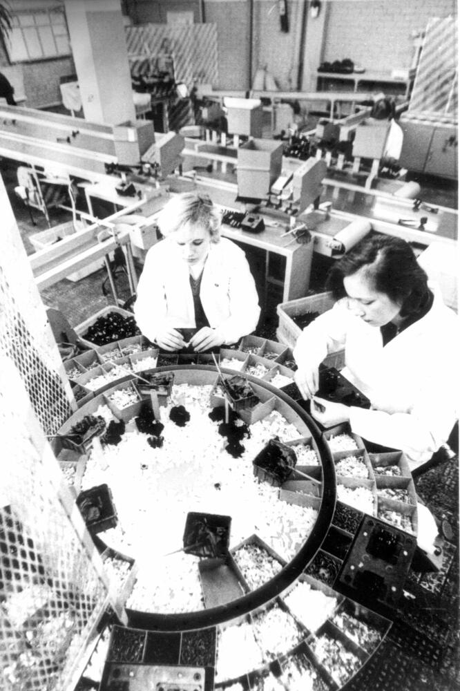 Darba process Rīgas autoelektroaparātu rūpnīcas montāžas cehā.