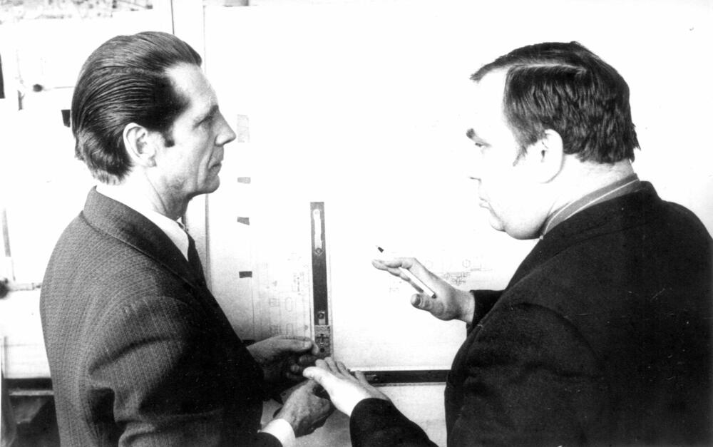 Rīgas autoelektroaparātu rūpnīcas konstruktoru biroja vadītājs V. Visnols (no kreisās) ar kolēģi V. Bojkovu darba laikā.