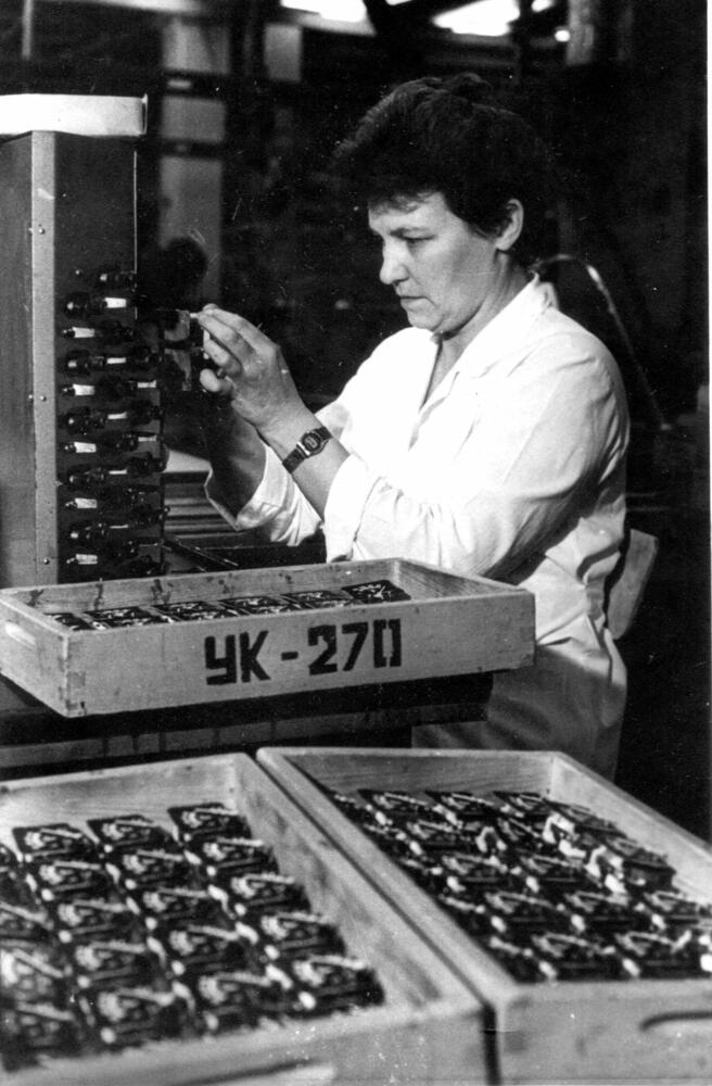 Rīgas autoelektroaparātu rūpnīcas darbiniece M. Himlāne pie mēriekārtu regulēšanas darba galda.