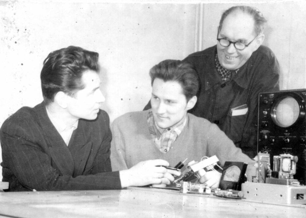 Rīgas autoelektroaparātu rūpnīcas konstruktoru grupas vadītājs Egons Spuris (no kreisās), inženieris konstruktors Raimonds Leiņš un izmēģinājumu ceha meistars E. Sergejevs.
