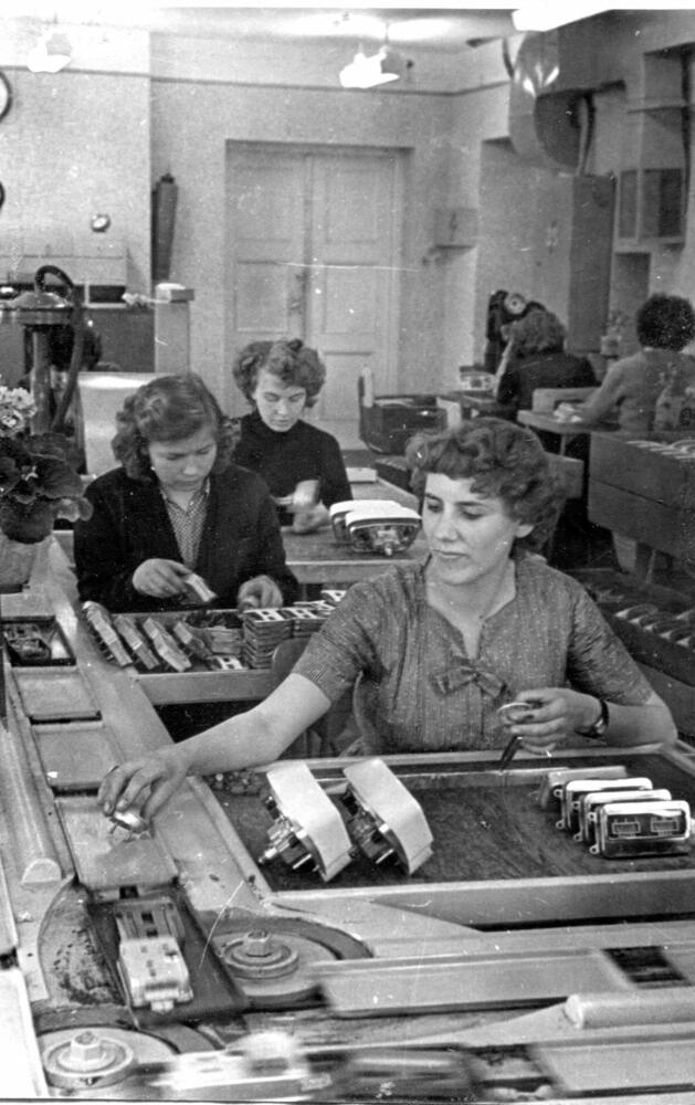 Darba process Rīgas autoelektroaparātu rūpnīcas automašīnu vadības paneļu montāžas iecirknī.